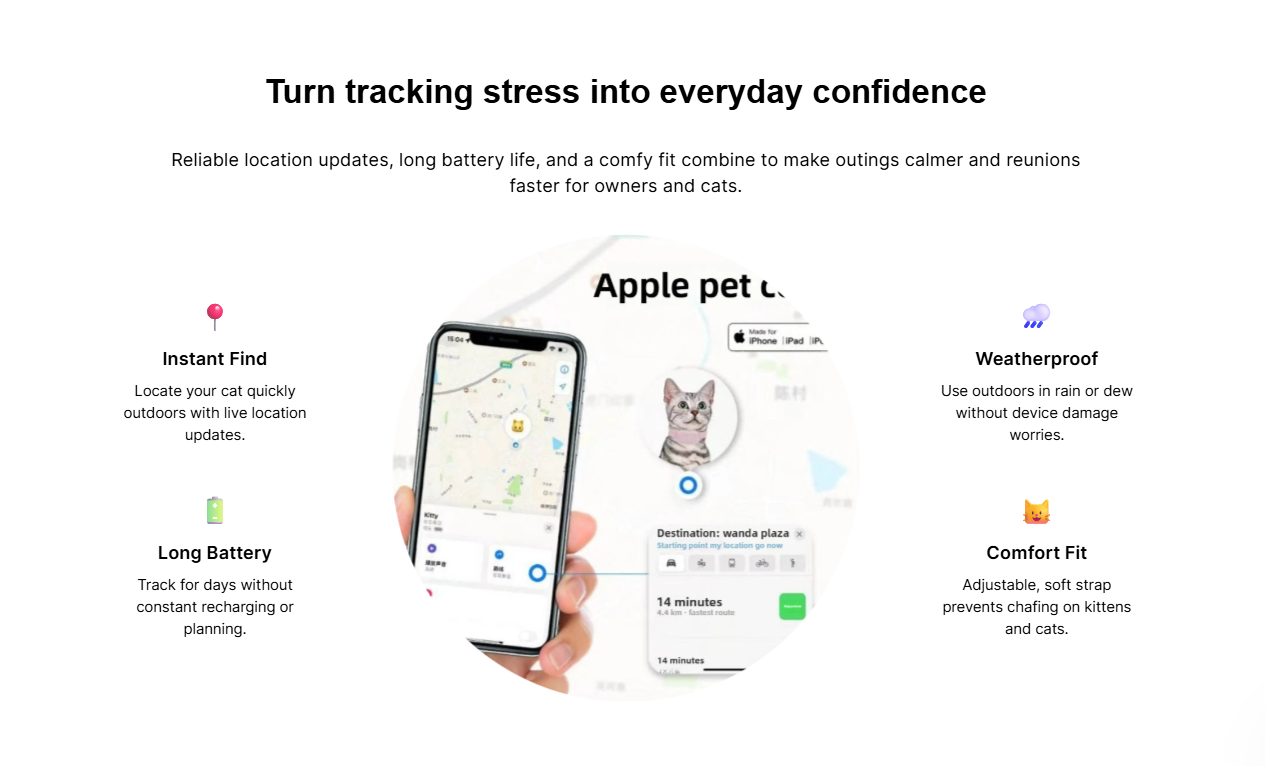 Real-Time GPS Tracking: Monitor your cat’s location anytime, anywhere via smartphone app.