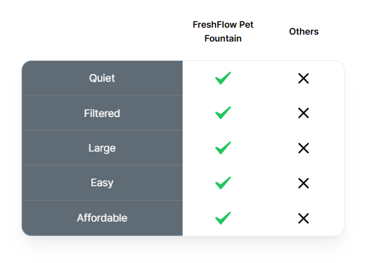FreshFlow blends quiet operation, reliable filtration, and large 1200mL capacity so pets drink more and owners clean less. Others sacrifice noise, capacity, or easy maintenance.